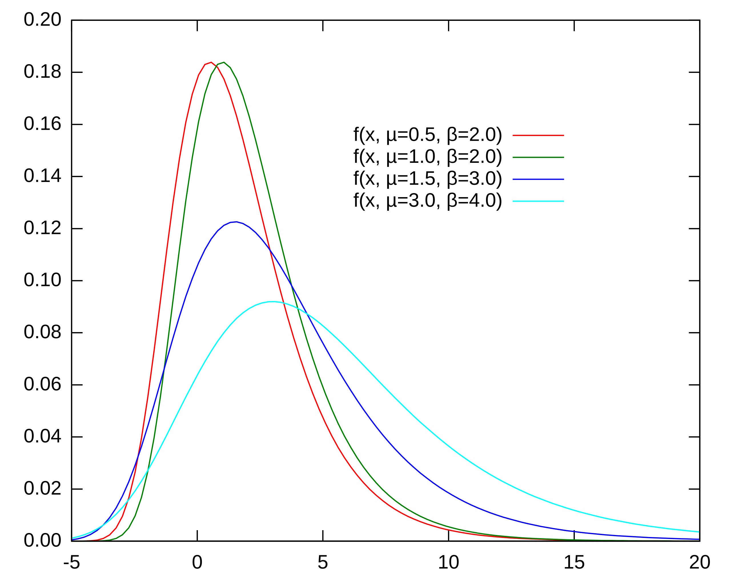 \(f(x) = \tfrac{1}{\sigma}\exp\left(-\tfrac{x-\mu}{\sigma}-\exp(-\tfrac{x-\mu}{\sigma})\right)\) |